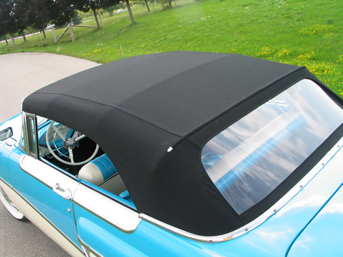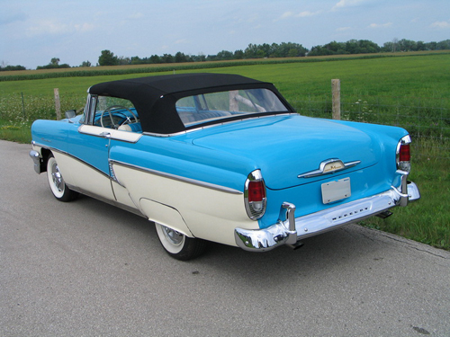 This is a spectacular example of one of the most desirable convertibles of the 50’s. Starting with a California body, a complete frame off restoration was performed and finished off with new chrome and two tone blue over white exterior. Since its complete refurbishment, the owner has also held the car to a rigid maintenance schedule. Engine rebuilt 500 miles ago. To ensure its continued service, the automatic transmission was overhauled at the same time with nearly 2,500 dollars spent including new cooler lines. The careful maintenance program has also meant the replacement of a ball joint, a windshield and a power window motor. In short, thousands have been spent on this car to keep it right and that’s on top of the restoration. Featuring dual exhaust, radio, fender skirts, matching interior, wide white walls, power steering, power brakes and added seatbelts, this is one investment that will be a joy to drive as well.
