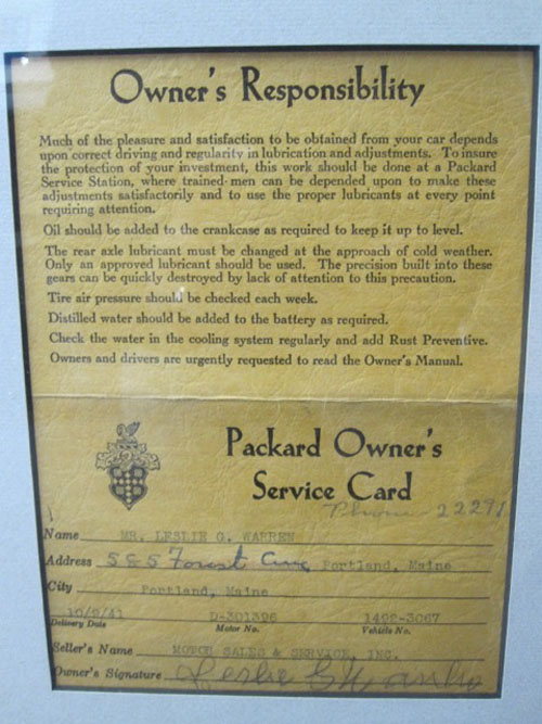 This Packard was sold new in Portland Maine and was still owned by the original family until early 2014. Still retaining the original Bill of Sale, and completed Packard owners’ card. also includes a number of Maine Operators License indicating the original owners date of birth (Feb 24, 1881). This great road car is equipped with accessory bumper guards front and rear, and accessory heater and included original spare, tools and jack. This outstanding survivor is in great original condition and the Packard Straight Eight runs and drives, as one would expect from a Packard. Truly a great touring Packard…..”Ask A Man that Owns One”