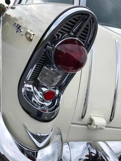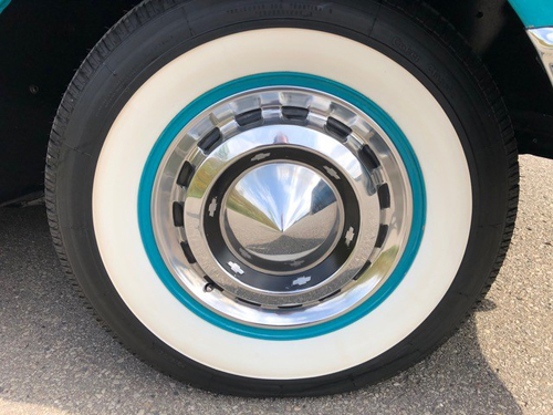 Before the car left California a previous owner had the original motor changed to an early 1960’s Chevrolet 327cid 250hp 4 barrel carburetor. Given that this was done previously, back in California we do not have any mechanical history on the motor. The transmission is the original two speed power glide. At time of refurbishment there was the addition of a Borgenson Power steering kit, a great addition to this car. Brand new gas tank was installed along with new fuel lines as well as brake lines throughout. With factory standard brakes this car stops very well, braking with ease and squarely. This Nomad starts with ease and drives very well. Brand new Coker Classic 15″ radials with proper width white wall have been installed.