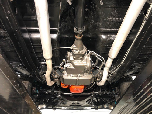 An outstanding all original panel California original sheet metal throughout. Stripped and refinished in its factory correct and original highly desirable colour combination of Twilight Turquoise over India Ivory. Finish is excellent, high quality smooth mirror like reflection throughout. There is a small metal imperfection on hood lip where header bar molding meets, please see detailed photo. All Brite work chrome and stainless was refinished to highest standards, including accessory front bumper guards and rear bumper end risers. Upon restoration it was decided to leave the undercarriage original, which still retains a portion of the factory original sound deadener while showing the original sheet metal you will see in detailed photos that the undercarriage was only painted black leaving portions of sound deadener along with original sheet metal. Lending to the condition and origanally. The photos also shoe original floor pans throughtout and original rocker panels.