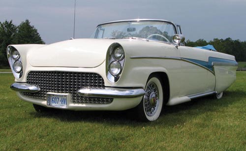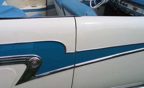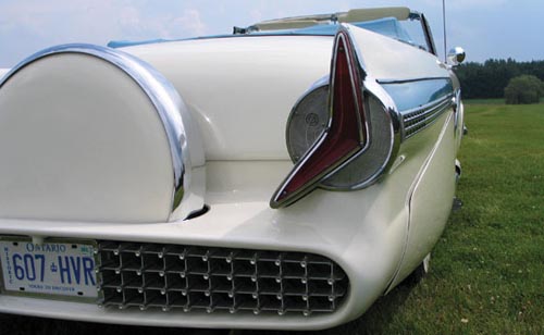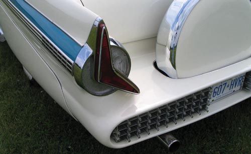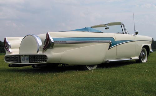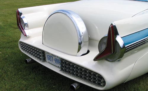 This early custom was built 45 years ago by Master builder Terry Hawirko using body solder to shape the exquisite lines. The grille and rear bumper sections were created from 1960 Cadillac grille bullits and the front bumpers are ’55 Pontiac, topped with ’59 Lincoln headlights. The lake pipes are functional and the rear quarter panels have been lengthened to accommodate the continental kit. The rear of the car has been fitted with Edsel station wagon tail lights and the cruiser skirts have been hand-manufactured using ’42 Packard hood halves. The wire wheels are courtesy of ’53 Ford Pace Car and power comes from a 351 cubic inch Ford V8 with automatic transmission. The interior is mostly original and accessories include power steering, power brakes, Town & Country radio, power top, dual spot lights, dual exhaust and new radial wide whitewall tires.