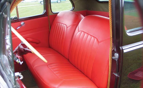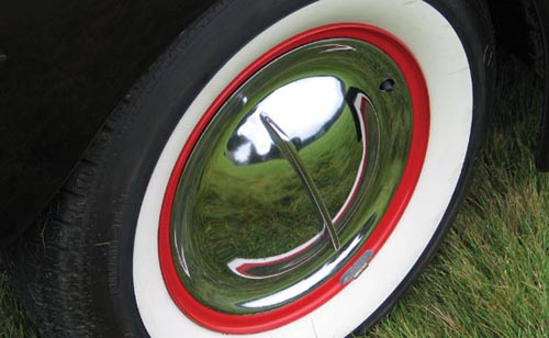 The radio, heater and stock gauges all work well, and the radial wide whitewall tires are mounted on 15 inch wheels with flipper-style hub caps. A custom made newer red leather interior has been installed as well.