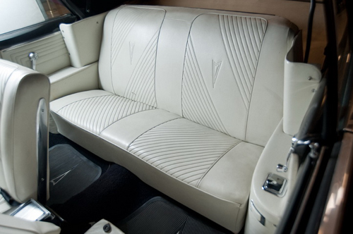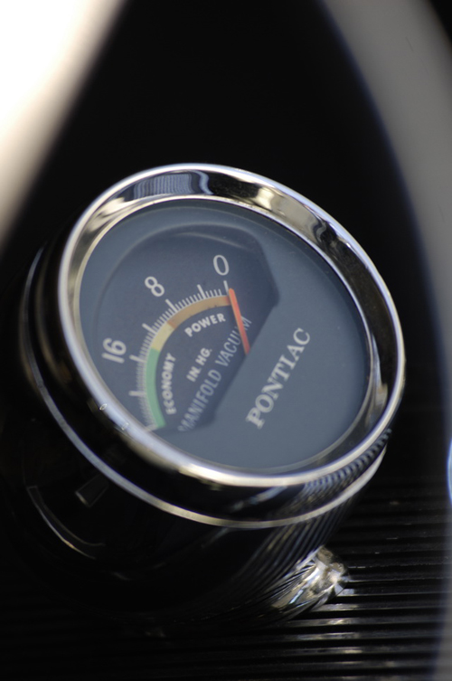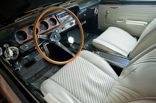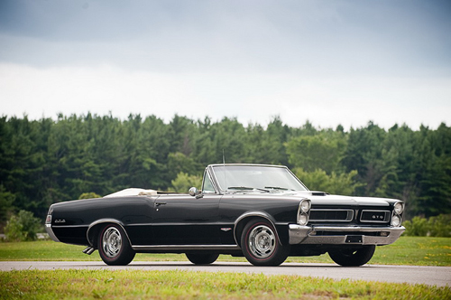 A fully PHS documented 65 GTO, this convertible is one of the few that came with factory A/C. It is also fitted with bucket seats and console, power steering and brakes, AM/FM radio, “power gauge”, and many other unusual options. An original Texas car, it was owned for 26 years by the first owner. It is believed that the only changes made to this car were the colour from the original Iris Mist paint to Starlight Black, a swap of the original Powerglide for a vastly improved Turbo-Hydramatic, and an added teak steering wheel – although the original wheel goes with the car. Other options include sport wheels with red line tires. exhaust splitters, freshly rebuilt original engine and PHS correct rebuilt four barrel carburetor. While the top and paint have been restored, the interior trim, carpets, etc., are original and in excellent condition.