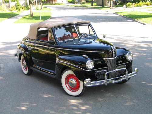 This pre-war Ford is finished in a beautiful Black coat of paint. The tan Haartz convertible top is in excellent condition and has the correct rear window and a black boot. The interior is done in red and tan with a woodgrain dash and gorgeous bakelite. Rechromed bumpers are equipped with optional wing tips. Other options are a radio, heater, power top and wide whitewall tires, beauty rings, front bumper guard and the centre mounted antenna.