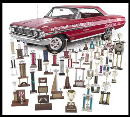 In 1971, George retired the car from racing and put it into storage where it remained until his passing. At this point, his son Al took on the stewardship of the car and treated it to the kind of restoration that happens when a car is family owned from new. This special order Galaxie comes with historic memorabilia including the original 1964 bill of sale, owner’s manual and brochure. Authentic VIN identification letter from Ford Canada. Twenty original 1st place trophies, and a collection of actual drag racing time slips (all from 1964 – 1970) Two Uniroyal tires from original sale. Two M&H vintage drag racing slicks ran on this car. Magnetic lettering for vintage display. Having been a drag car, there are less than 25,000 original miles on this incredible car. All documents of restoration including step-by-step photography. Engine rebuild and documentation by Entec Racing.