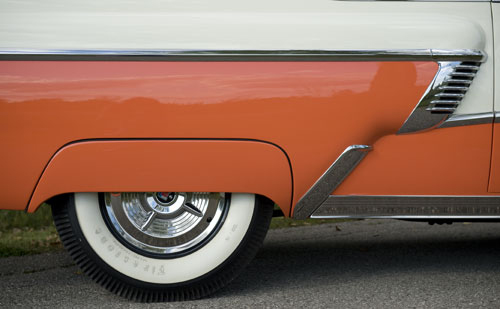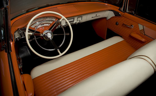 Finished in its original colour combination of Persimmon over Classic White with a matching interior, the Montclair’s lines are enhanced by a black power-operated convertible top and a Persimmon boot. In addition, an abundance of excellent brightwork, a driver’s side spotlight, rear fender skirts, period correct wide whitewall tires, and “spinner” wheel covers complete the 1950s look. The many options include a Deluxe steering wheel, power steering, power brakes, a power front seat and power windows, as well as a Town and Country Radio and a clock. The underhood area reveals an exceptionally detailed 312 cubic inch V8 engine, topped with a set of aluminum valve covers with the distinctive Mercury insignia.