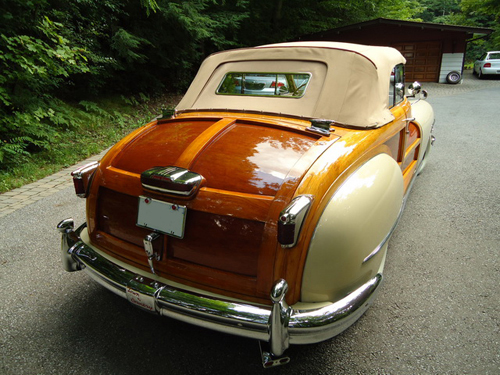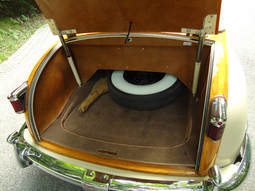 A highly collectible classic car. Rebuilt straight-eight motor, fluid-drive transmission, leather and cloth interior, dual heaters, power top, radio, wide whites and dual spotlights. The rot free ash and mahogany wood is handsomely varnished and neatly finger jointed.