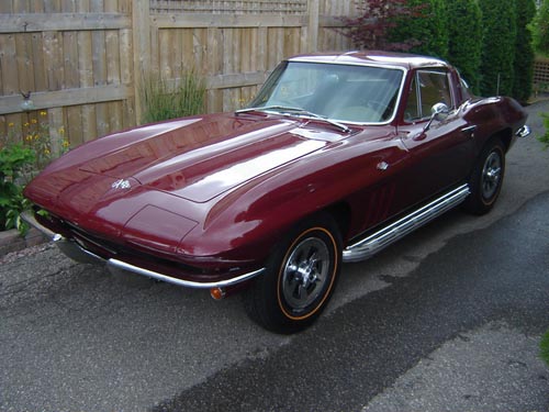 This 1965 Corvette Stingray sports the L76 327 ci, 365-hp V-8 engine with a four-barrel carburetor.This three owner vehicle has had a complete body-off restoration with factory correct components and is finished in Milano Maroon. Standard equipment for this year includes a tachometer, heater, defroster, safety belts, four-wheel disc brakes, extensive instrumentation, plus many other features. The side mount pipes were an extra cost option. Leather seats accentuate the luxury that accompanies very quick quarter-mile and 0-60 times. This Corvette has been well cared-for and it has never been used in rain or snow.