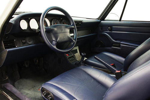 This 1995 993 Cab has a 6 speed manual transmission, as well as a Metropole blue vinyl roof. The car is very distinctive thanks to its white on blue colour combination.