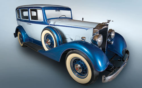 With a handsome two-tone blue finish, this stately Packard is enhanced by blue painted wire wheels, a side-mounted spare tire, and beautiful brightwork.
