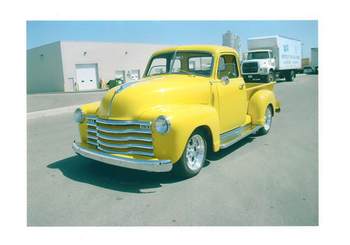 Finished in Mazda protégé yellow paint, with custom molded door panels, molded headliner and custom bench seat finished in two toned yellow and black leather sets off the interior of this vehicle. Dakota Digital Gauges compliment the dash, a small leather sports steering wheel completes the black, chrome, and yellow interior motif. The pickup bed in this vehicle is oak planks with chrome rails. Four coats of marine stain and six coats of varnish have been applied to the Oak planking. Custom quick fill fuel tank. Chrome rear view mirrors, chrome hood ornaments, chrome grill and chrome running boards adorn the body. Yes…..that is Chip Foose’s autograph on the dash of this unit as he signed it at the Atlantic Car Show in Moncton. Vehicle has under 3000 total kilometers on it to date.
