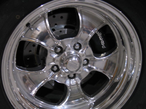 The suspension consists of a Shockwave Air Ride adjustable suspension while the chrome steering column is from ididit. Front suspension is Mustang polished stainless tubular control arms with power rack and pinion unit and front sway bar. A Ford 9 inch differential with 3.55 gears was selected. Rear suspension is a polished stainless four link air ride suspension. Four piston power Wilwood brakes do the stopping chores, vented discs on all four corners, 225/55/17 tires are mounted to American racing 17×8 polished alloy Hopster wheels. The exhaust system consists of stainless headers attached to twin 409 SS series Flow Master mufflers.