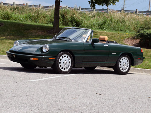 1993 Alfa Romeo Veloce Series-IV Spider. An incredible opportunity … 21,488 original kilometers (891 average annual kilometers). Automatic transmission. 2.0 liter twin-overhead cam. Motor producing 165-horsepower, with Bosch K Jetronic Fuel-injected motor (only year of production)! Air-conditioning, leather/suede handstitched interior. Sport seats, power steering and brakes. Leather sport Alfa Romeo sport steering wheel. “Veloce” Edition Series option. 1-0f-1956 (app) Spiders built for entire last year of worldwide production !! (*Canadian vehicle) 1-0f-40 (app) built for Canadian production model year. 1-0f-4 (app) with rare automatic transmission option! Aluminum wheels. Four virtually brand-new tires. Fully certified!! All Original. Absolutely new condition. Incredibly Rare. Very desirable, and still affordable. A very special opportunity.
