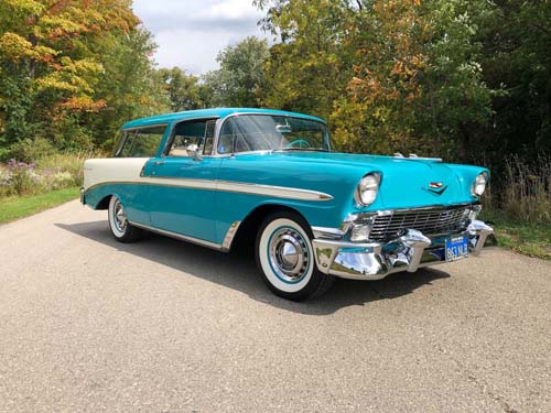 An outstanding vehicle that still boasts all of its original West Coast, corrosion free sheet metal. An incrediby solid, dry example that was refinished in the best colours, and coincidentally the same combination it wore when new. It is Twilight Turquoise over India Ivory with a new and fully corect, stunning interior of the proper turquoise. Restored to near perfection, this Nomad has excptional chrome and stainless trim. A gorgeous Chevrolet that runs and drives as fine as it looks. This is a rare opportunity to secure a true California 1956 Nomad!