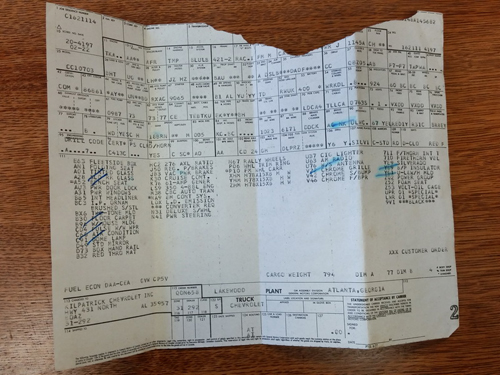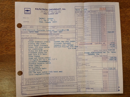 Ordered new in Alabama and from there it went to Texas. Optioned with 350 four barrel V8, automatic, tinted glass, sliding rear window, wiper delay, air conditioning, bed side rails, power brakes, cruise control, power steering, Rally wheels, chrome grille, rear step bumper, cloth interior, power locks, power windows, gauges and Silverado trim. Has original Bill of Sale, owners manual, warranty booklet and factory build sheet.