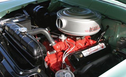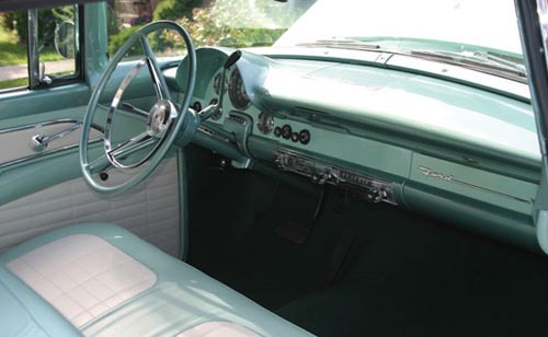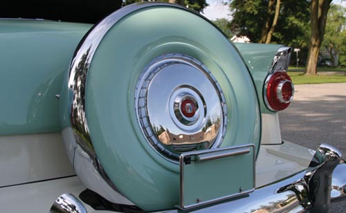 Fresh restoration July’09. Gorgeous two-tone colour combination of Meadowmist Green and Colonial White. Rebuilt 312 engine as well as a rebuilt automatic transmission.Odometer shows 76,773 miles but it is unknown if those are actual. Options include: power top, black Stayfast (canvas), with new cylinders, hoses and pump. Continental kit, factory fenderskirts, rocker mouldings, power steering, new dual exhaust through the bumpers, AM radio, clock, dual side mirrors, new wide white wall tires. Complete new brakes, detailed undercarriage; engine bay and trunk compartment.